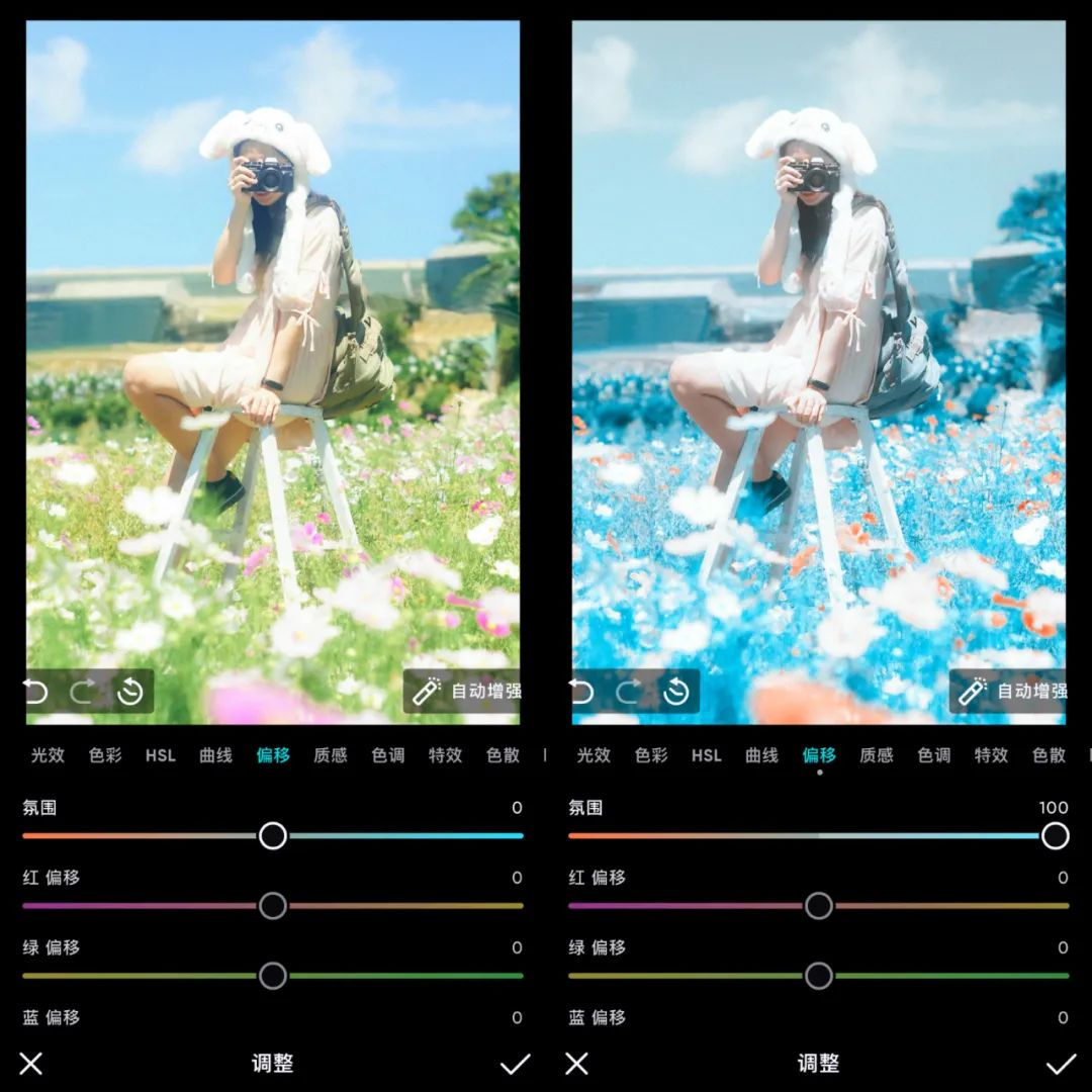 สำหรับรูปแบบใบไม้สีน้ำเงิน แนวคิดการปรับทั่วไปคือการใช้เครื่องมือ HSL เพื่อลดความอิ่มตัวของสีทั้งหมดในภาพให้เหลือน้อยที่สุด ยกเว้นสีแดงและสีส้ม จากนั้นจึงใช้เครื่องมือแยกโทนสีเพื่อเพิ่มโทนสีน้ำเงินลงในพื้นที่เงาของ ภาพจะแสดงเป็นสีน้ำเงิน สี ดังนั้นขั้นตอนการประมวลผลโดยรวมจึงค่อนข้างยุ่งยาก การใช้เครื่องมือ "ชดเชย" เราจึงสามารถบรรลุรูปแบบใบไม้สีน้ำเงินได้อย่างง่ายดาย