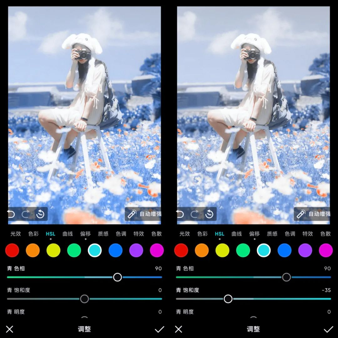 จากนั้นเราเปิดแผง HSL และเพิ่มเฉดสีของสีฟ้า ในขณะนี้ สีฟ้าในภาพเปลี่ยนเป็นสีน้ำเงิน ในขณะนี้ โทนสีโดยรวมของภาพกลายเป็นสไตล์ใบไม้สีน้ำเงินทั่วไป นอกจากนี้เรายังสามารถใช้เครื่องมือ HSL เพื่อควบคุมความอิ่มตัวของสีน้ำเงิน