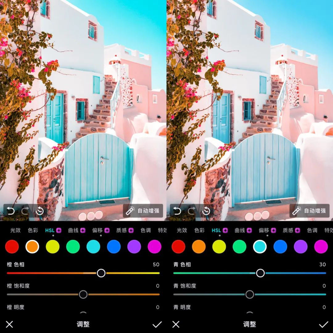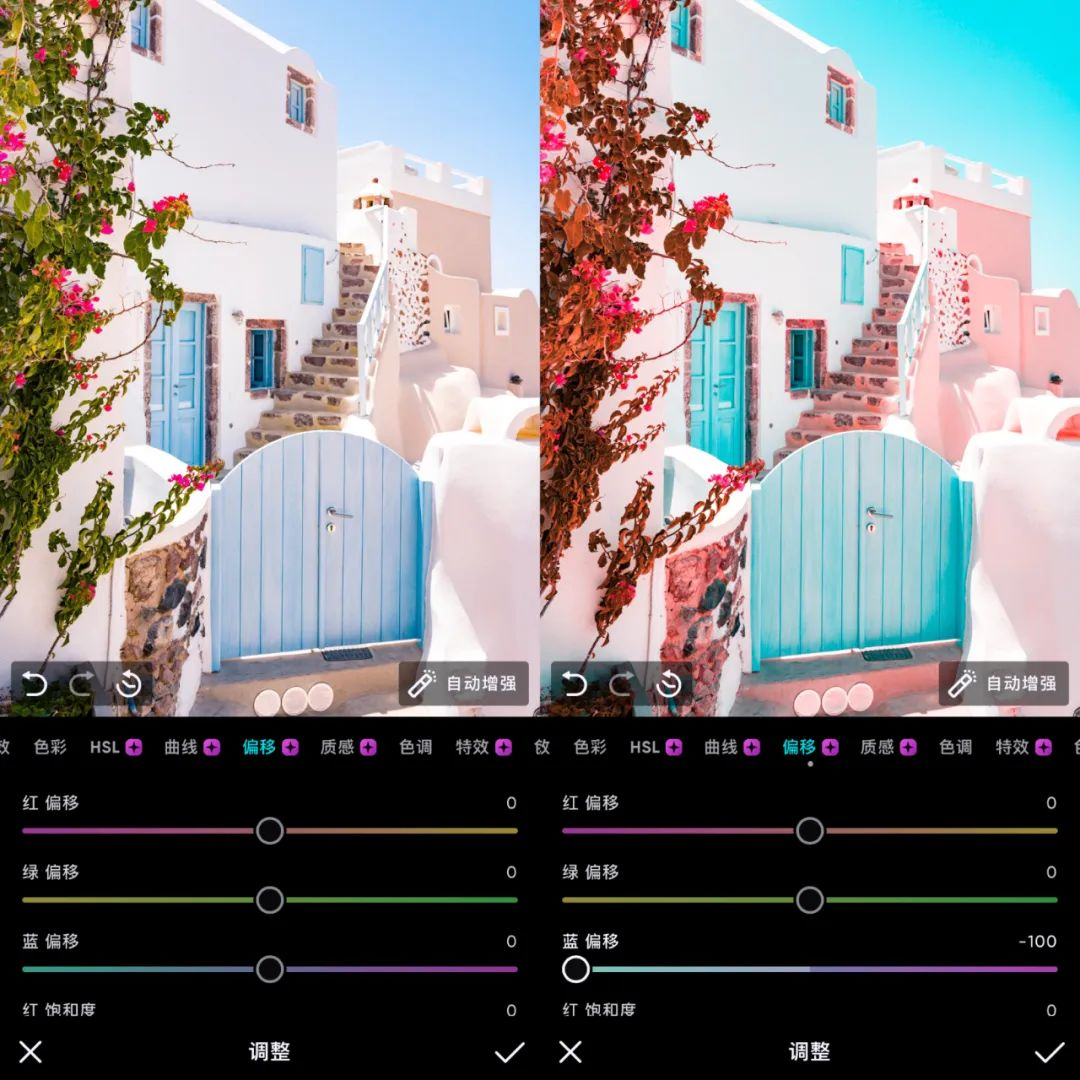 สำหรับสีลูกกวาด แนวคิดการปรับแต่งแบบเดิมคือการใช้เครื่องมือ HSL เพื่อแปลงสีในภาพเป็นสีแดง ส้ม และฟ้าสามสี แต่การดำเนินการโดยรวมค่อนข้างยุ่งยาก หากเราใช้เครื่องมือ "ชดเชย" เราจะ สามารถบรรลุ Tune สีน้ำเงิน-แดงได้อย่างรวดเร็ว